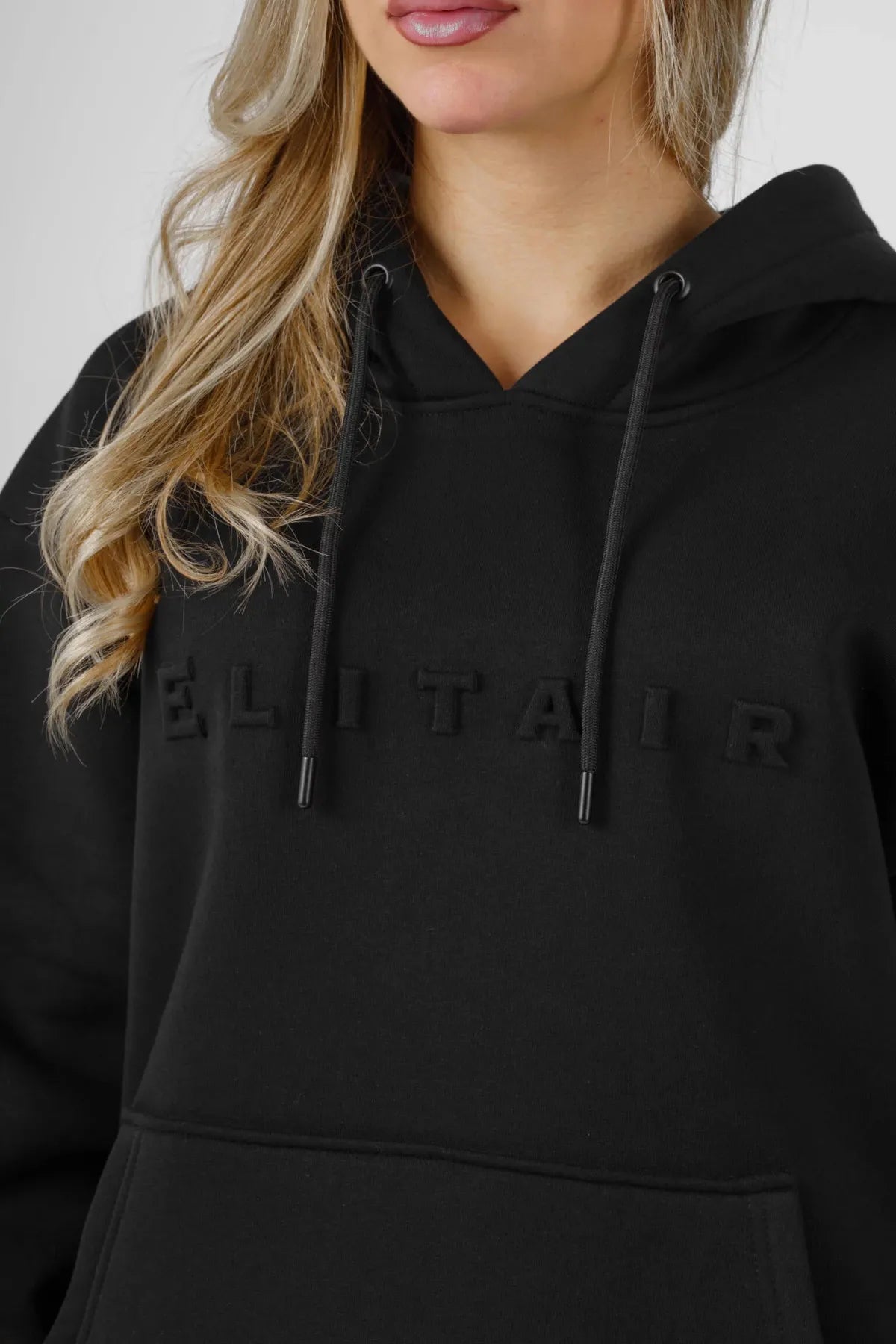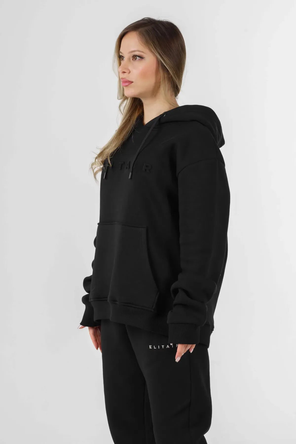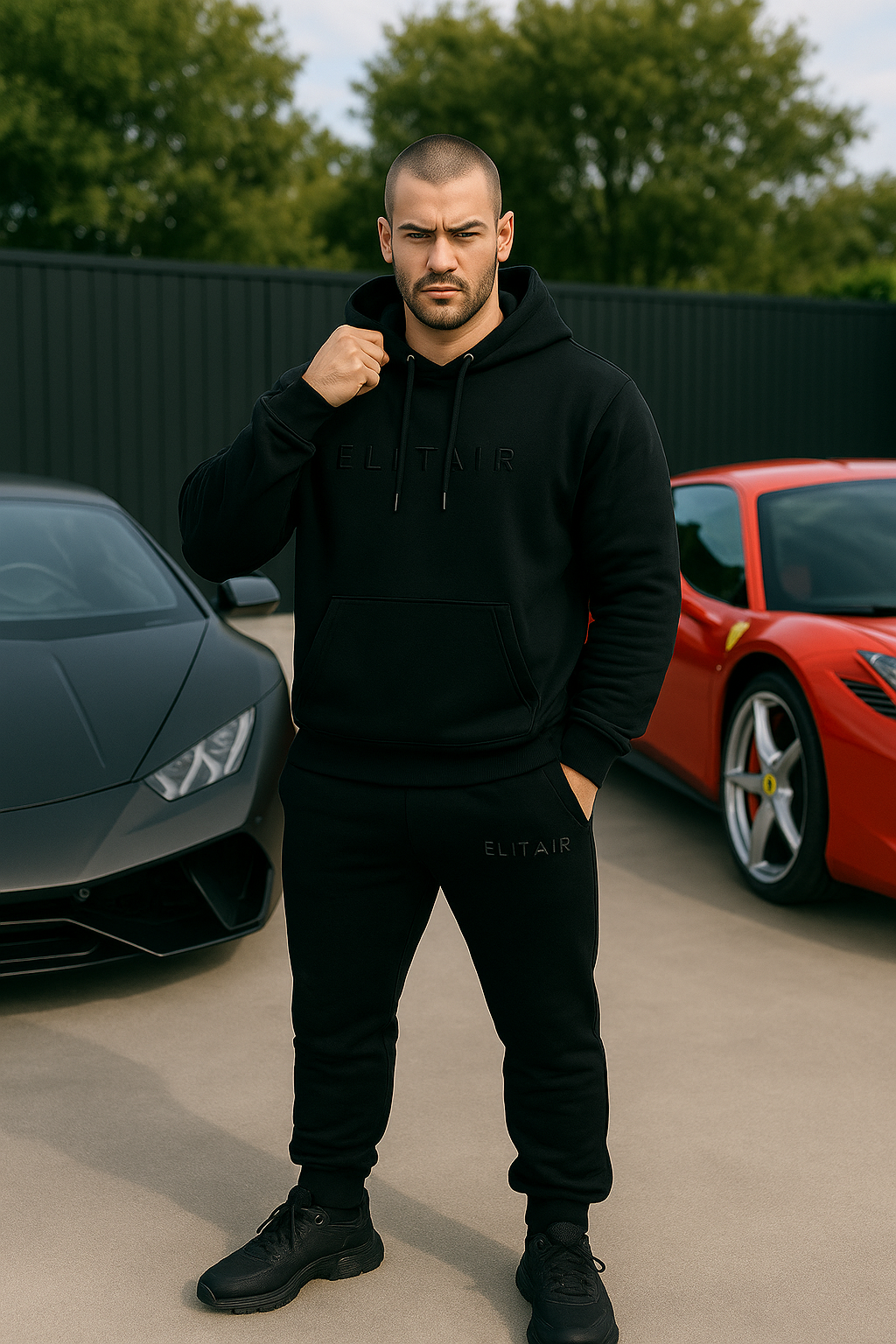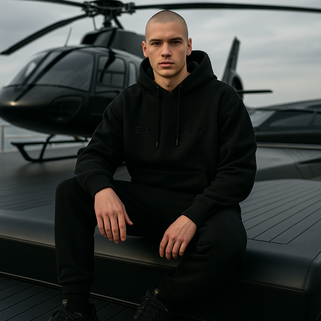 Siyahın asaletini Elitair’ın ikonik tasarımıyla buluşturan bu hoodie, her ortamda fark yaratır.